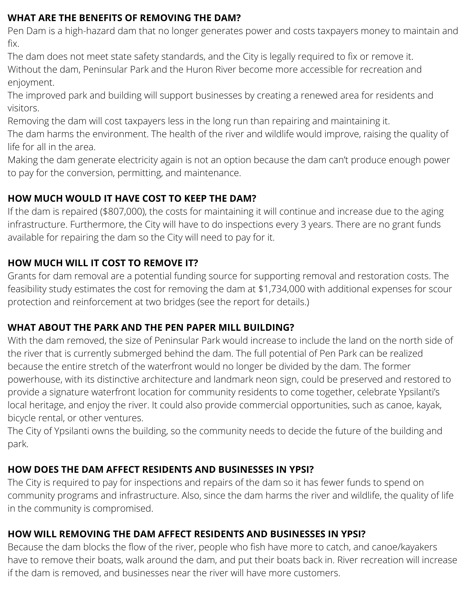 In the autumn of 2021, the City led public forums to maintain transparency, convey information, answer questions, and encourage residents to guide the vision for river restoration. An ad hoc committee of volunteers, stakeholders and city officials led this public engagement process. The committee’s meetings are public; agendas, minutes, and links to meetings can be found through the Agenda Center on the City of Ypsilanti’s website under the heading “Pen Dam Public Engagement Committee.”